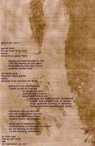 when it was published in ARTLIFE for example, I was able t format it so the stanzas go in and out toward the middle of the page like a ridge with the 9 line middle part (the other stanzas are all 4) extends into the center… I’m going to try to work on formatting on the blog hopefully tonight and ge tit so it has the concrete aspect.