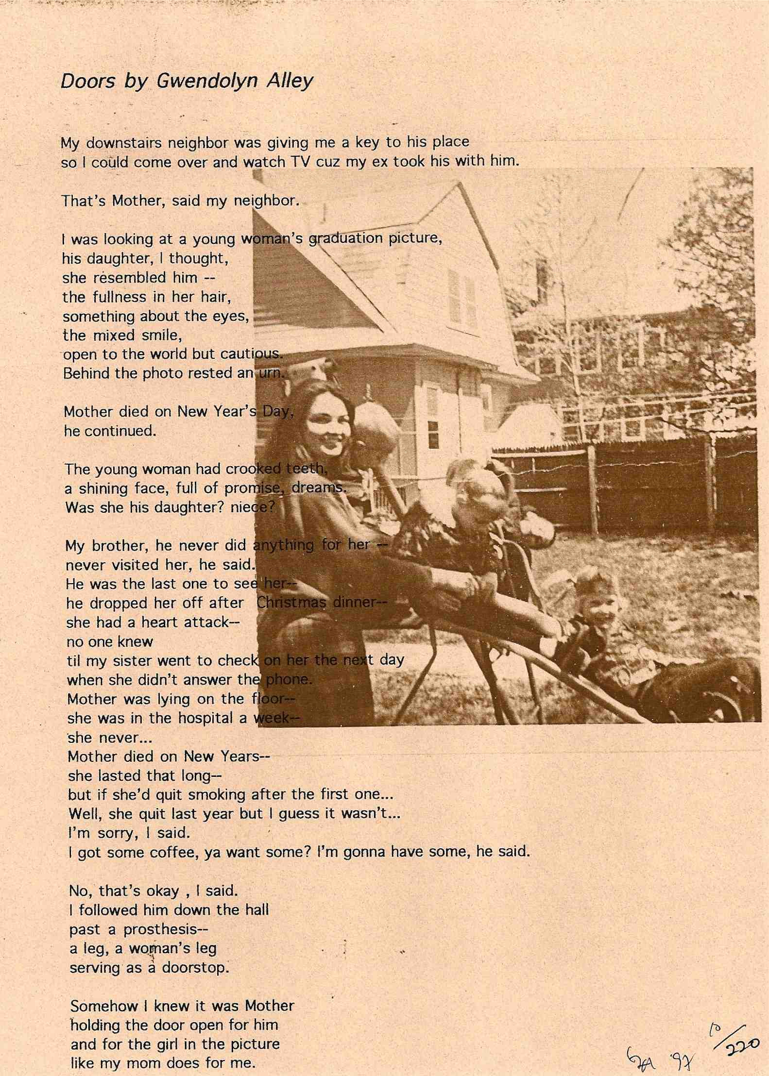 I published this poem as a broadside for ArtLife Limited Editions May 1997 copying an old family photograph in brown ink sepia like onto brown paper, then copying the text on top in blue, finally numbering and signing it in an edition of 200. I gave 105 to ArtLife and kept the rest to sell. If you are interested in one, let me know!
