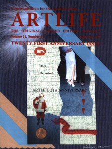 ART/LIFE was a limited edition art and lit magazine that published 11 issues a year for 25 years. I produced 30 or more broadsides with my art and poetry in it for about 10 years, from 1995 to 2004. Above is the cover of the Dec. 2001 (Issue #232) below is a broadside I did of my 3:15 experiment poem “waiting” as published in that 19th anniversary issue. The brad in the middle that serves as hands rotates, as does the clock face to reveal the poem as the reader spins it around. I posted the poem (text only) back in January but I am