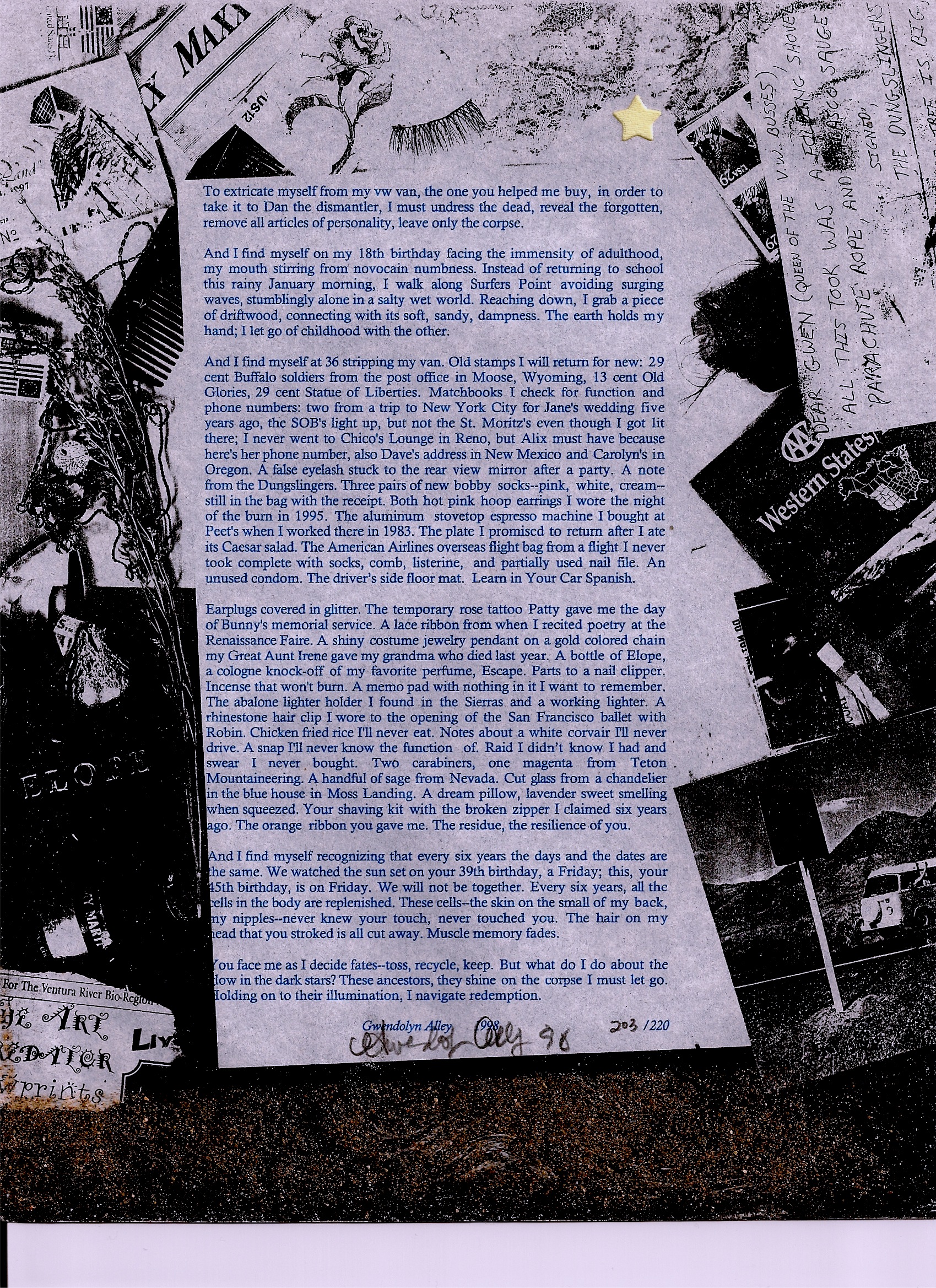 And I find myself at 36 stripping my van. Old stamps I will return for new: 29 cent Buffalo soldiers from the post office in Moose Wyoming, 13 cent Old Glories, 29 cent Statue of Liberties. Matchbooks I check for function and phone numbers: two from a trip to New York City for Jane’s wedding, the SOB’s light up, but not the St Moritz even if I got lit there; I never went to Chico’s Lounge in Reno but Alix must have because here’s her phone number, also Dave’s address in New Mexico and Carolyn’s in Oregon. A false eyelash stuck to the rear view mirror after a party. A note from the Dungslingers. Three pairs of new bobby socks–pink, white, cream–still in the bag with the receipt. Both hot pink hoop earrings I wore th night of the burn in 1995. The aluminum stovetop espresso machine I bought at Peet’s when I worked there. The plate I promised to return after I ate its ceasar salad. The American Airlines overseas flight bag from a flight I never took complete with socks, comb, listerine, and partially used nail file. An unused condom. The driver’s side floor mat. Learn in Your Car Spanish.