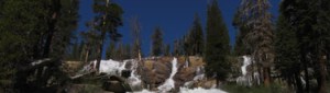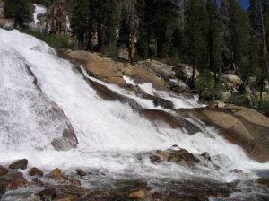 Since we’re getting such a late start, and we have a small boy, we take the shuttle to the Devils Postpile NPS Ranger Station to cut off about 1 mile from our proposed 3 mile round trip hike. From the Ranger Station, we hike southwest a bit, then cross the river on a bridge. We climb a bit on well made, well signed trail of pumice gravel and decomposed granite under ample pine tree shade. Within no time, we’ve scrambled off the trail to the base fo the falls, and the boy has his feet in the cool water. We put his red Teva river shoes for a better grip on the slippery rocks, and soon he’s wet and happy.
