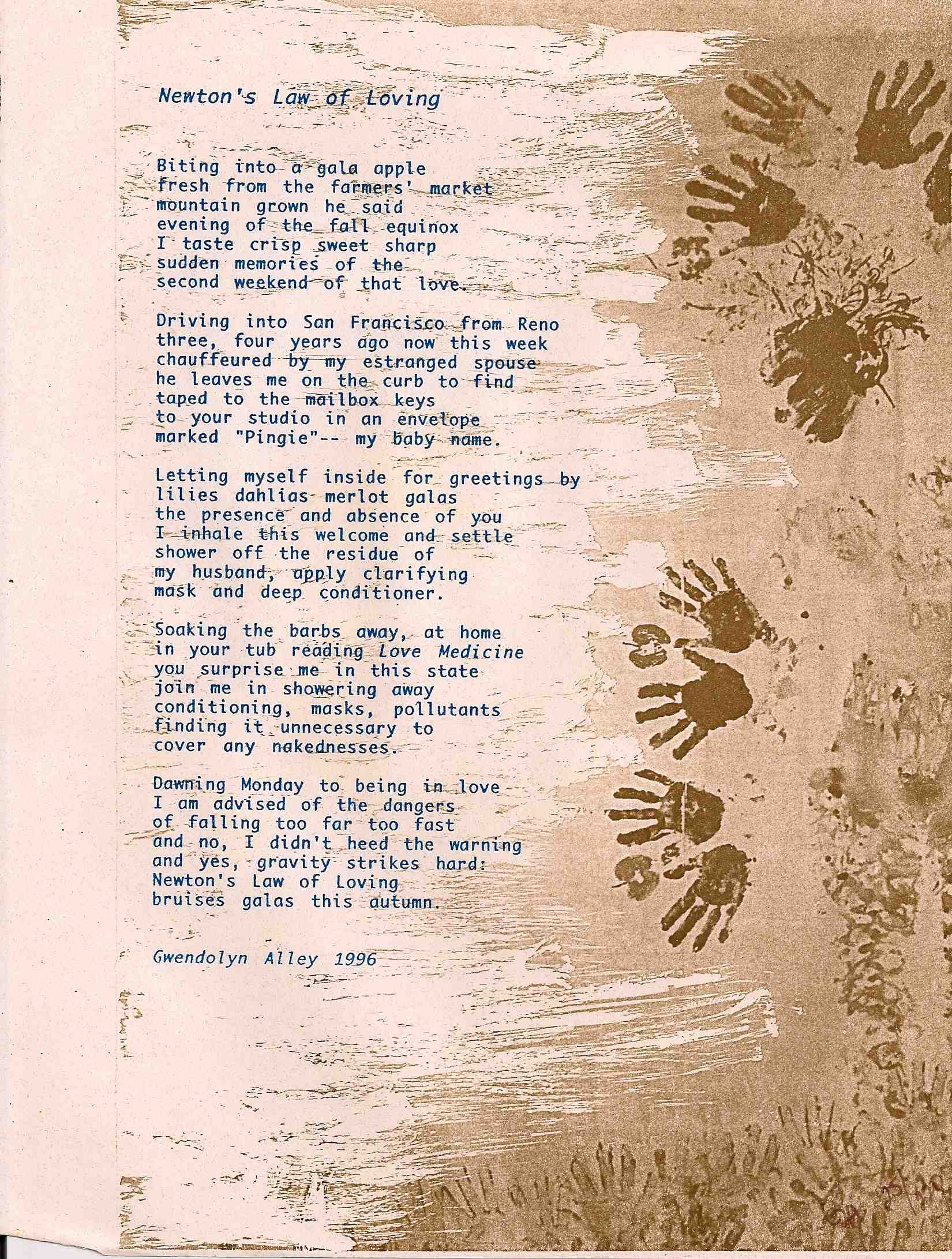 I wrote this poem when I was ushering and thought it apropos for today’s first day of fall. The body painting uses apples impressed in the fabric as well as my body which I painted in the golden fall colors and mottled bark of a sycamore tree, then wrote the poem alongside; for an October group show at Art City, it hung above an accompanying installation of apples, fall dried flowers, sycamore branches and leaves. For the ArtLife broadside which was published in the October 1996 issue and was the second one I did, I photographed the painting, used white out to cover the now illegible words I had written on it, and printed the painting using brown ink and the text in blue. The broadsides are signed and numbered and available as is one of the two original paintings I did at the time.