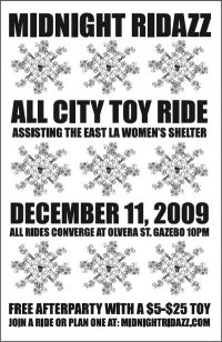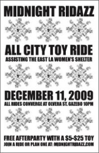 Tonight, bicyclists from all over L.A. County will descend on Downtown L.A. bearing toys to be collected and distributed to kids by a local charity like they do every year in an All City Toy Ride; this year the Midnight Ridazz will be assisted by the East L.A. woman’s shelter in giving out the toys.