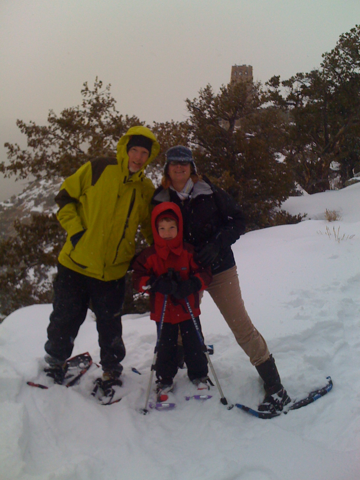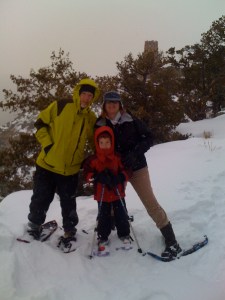 Yesterday, it snowed here in Flagstaff–and snowed! It snowed all the previous night too. Seemed like a great day to take the snow shoes for an adventure at the Grand Canyon.