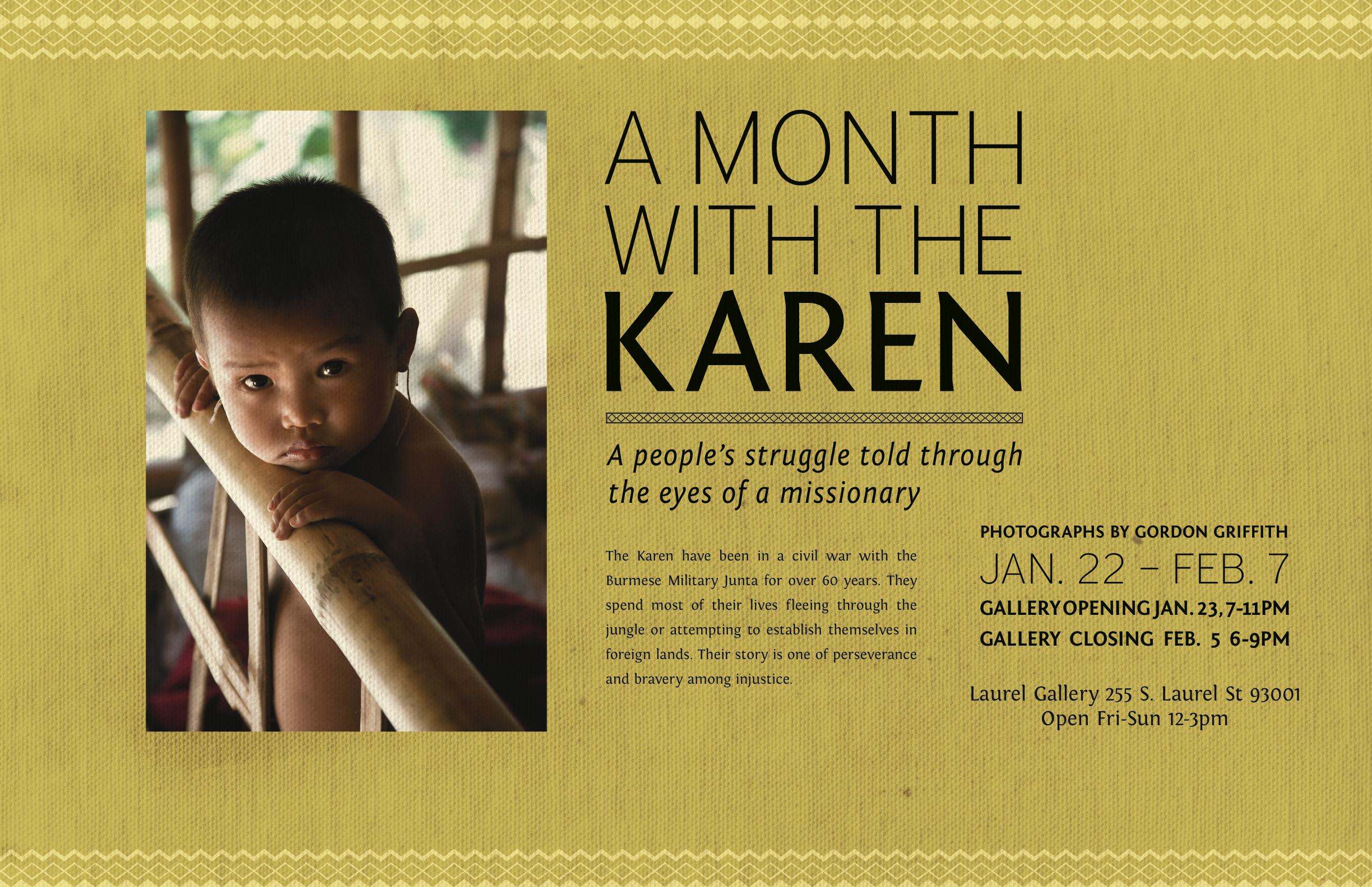 a Brewery (bring money to donate and your own cup please!), to hear Dew Wat’s Rite, and attend the closing reception at the Laurel Gallery for A Month with the Karen: A People’s Struggle Told Through the Eyes of a Missionary Photographs by Gordon Griffith.