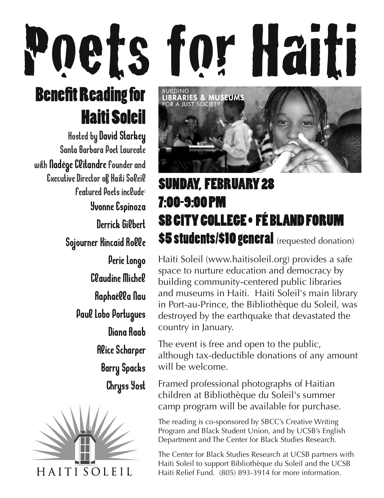 7:00 POETS FOR HAITI at Fe Bland Auditorium, SB City College, Cliff Drive, Donations to Haiti Soleil. Click on the image to enlarge for more details.