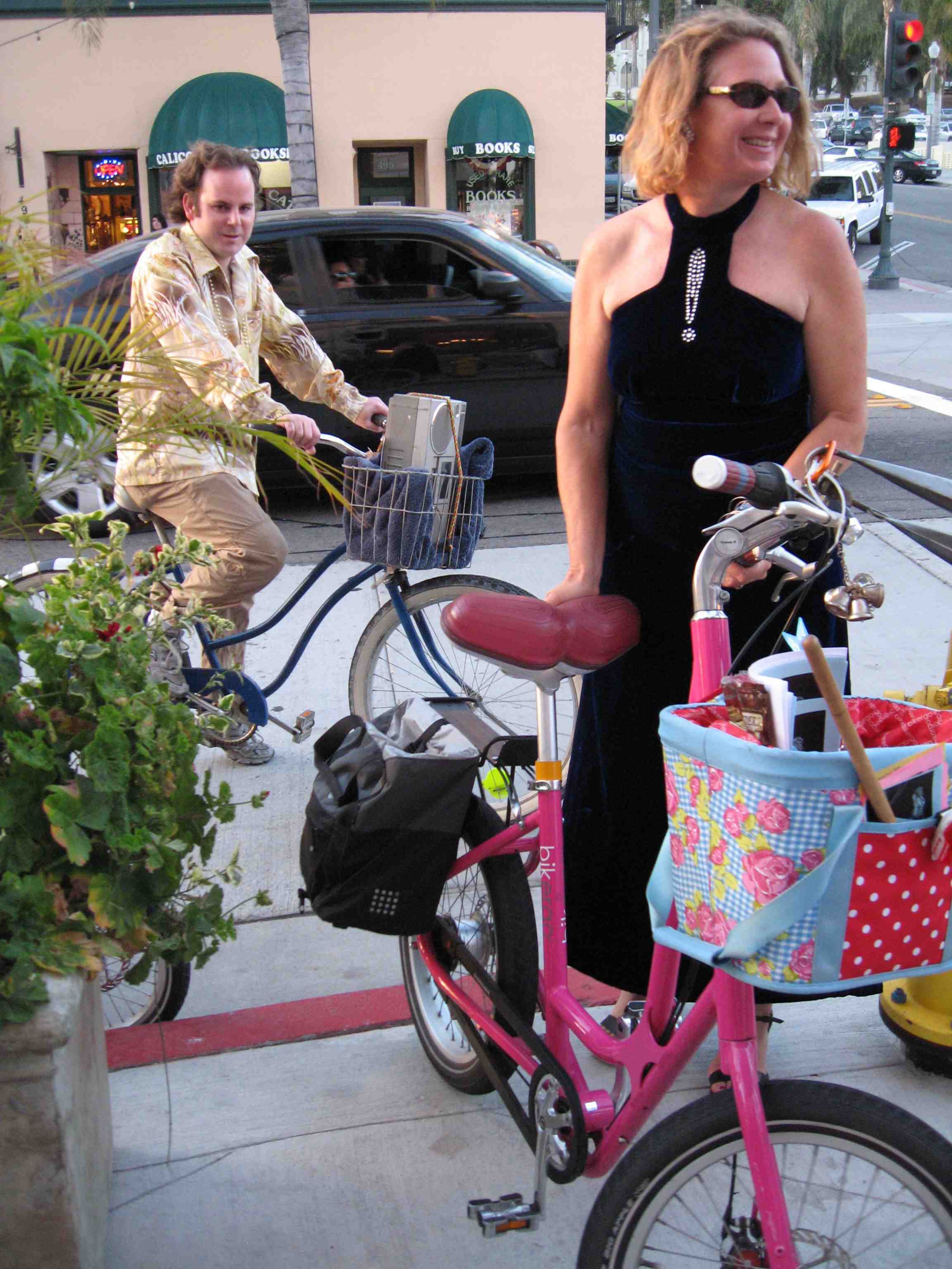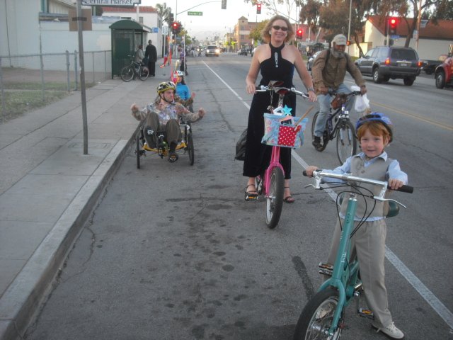 As you can see, my small boy is dressed in his Disco best and riding his seafoam green bikergo while I am in my blue velvet exclamation point dress and riding my hot pink bikergo.