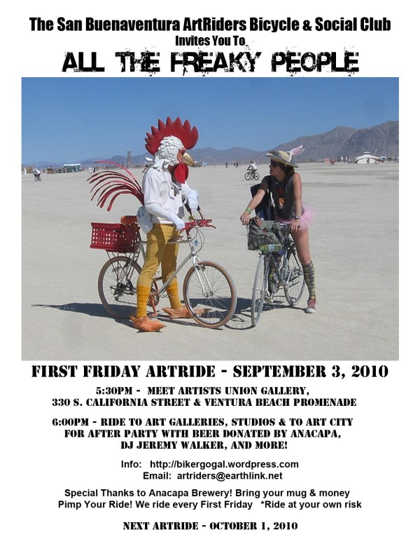 So please join us next Friday Sept. 3 at 5:30pm on the Ventura Beach Promenade in your Burning Man best. We’ll ride about 6pm along the beach and to various art exhibits. We’ll land at Art City for an after party with beer from Anacapa, wine from Frei Brothers, and music from DJ Jeremy Walker.If you’re on facebook, please friend the San Buenaventura ArtRiders Bicycle & Social Club.