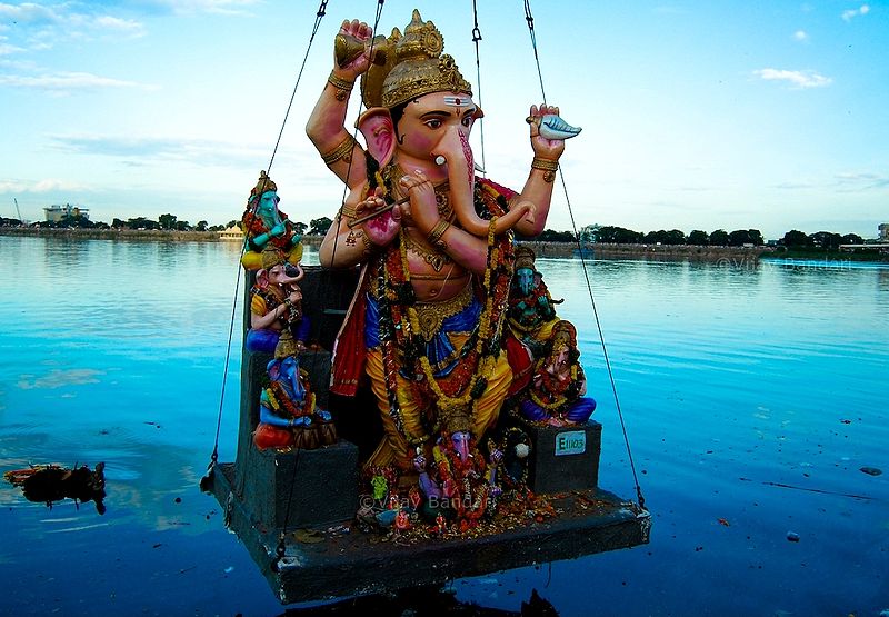 Saturday, Sept. 11 in 2010 marks the date of the end of the 10 day Hindu festival Ganesh Chaturthi celebrating the birthday of Lord Ganesh. During the Hindu festival of Ganesha, the elephant-headed son of Shiva and Parvati is believed to bestow his presence on earth for all his devotees. His birthday is celebrated on a slightly different day each year as it coincides with the phase of the moon. Here’s more from Wikipedia on Ganesh Chaturthi; I found the photo below there.