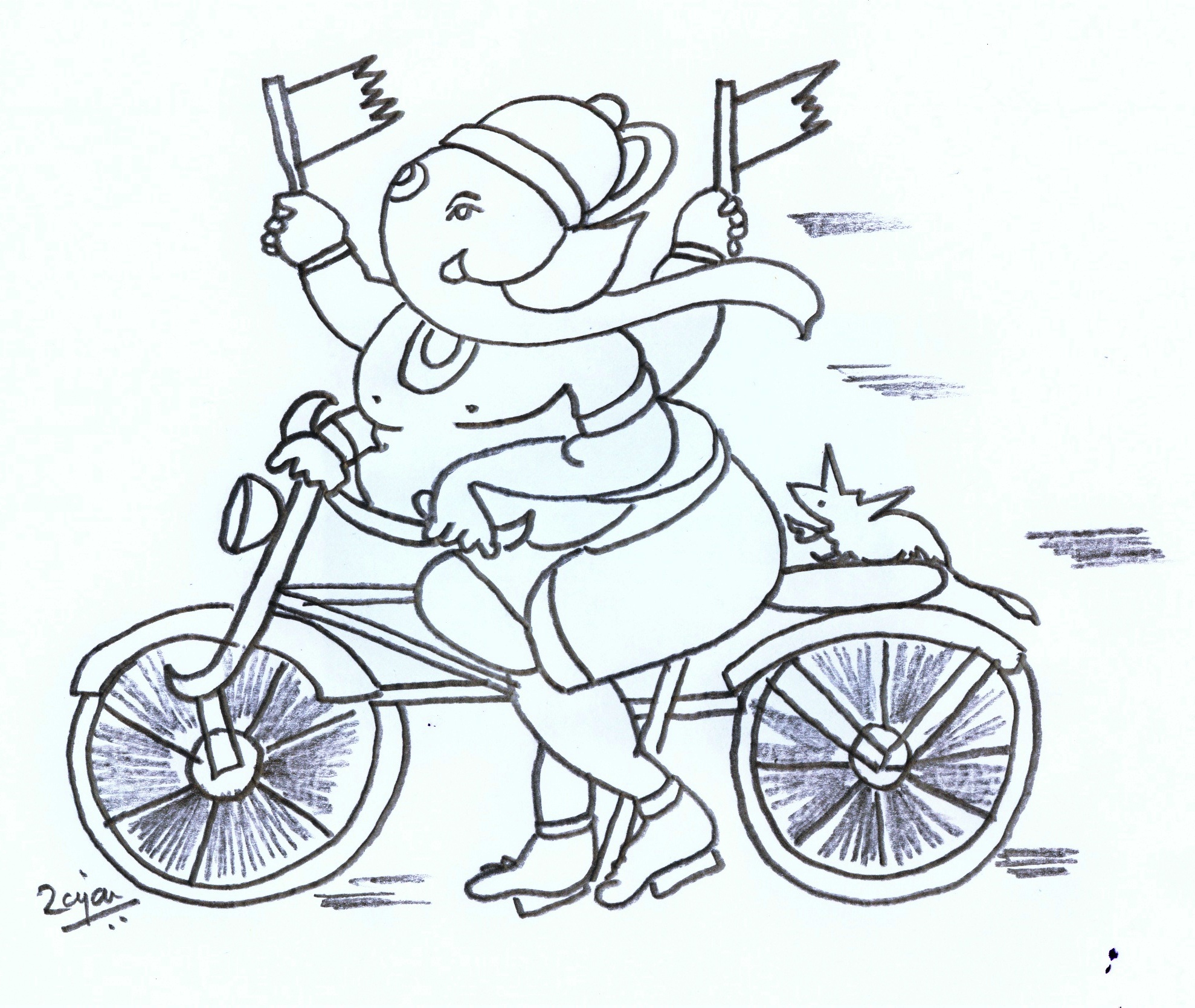 Last year for Burning Man, I asked Rajan of Rajan Draws to do a Ganesh on a bicycle for me: his whole blog is dedicated to his drawings of Ganesh. He sent me these two drawings right away and we turned the top drawing into stickers and tie-dyed bandanas. As Ganesh Chaturthi last year was on the First Friday of the month and during Burning Man, we led a bike ride with beautiful banners with Ganesh on them, and we gave out the banners and bandanas. We told hundreds of people about Ganesh and asked them to celebrate his birthday with us.