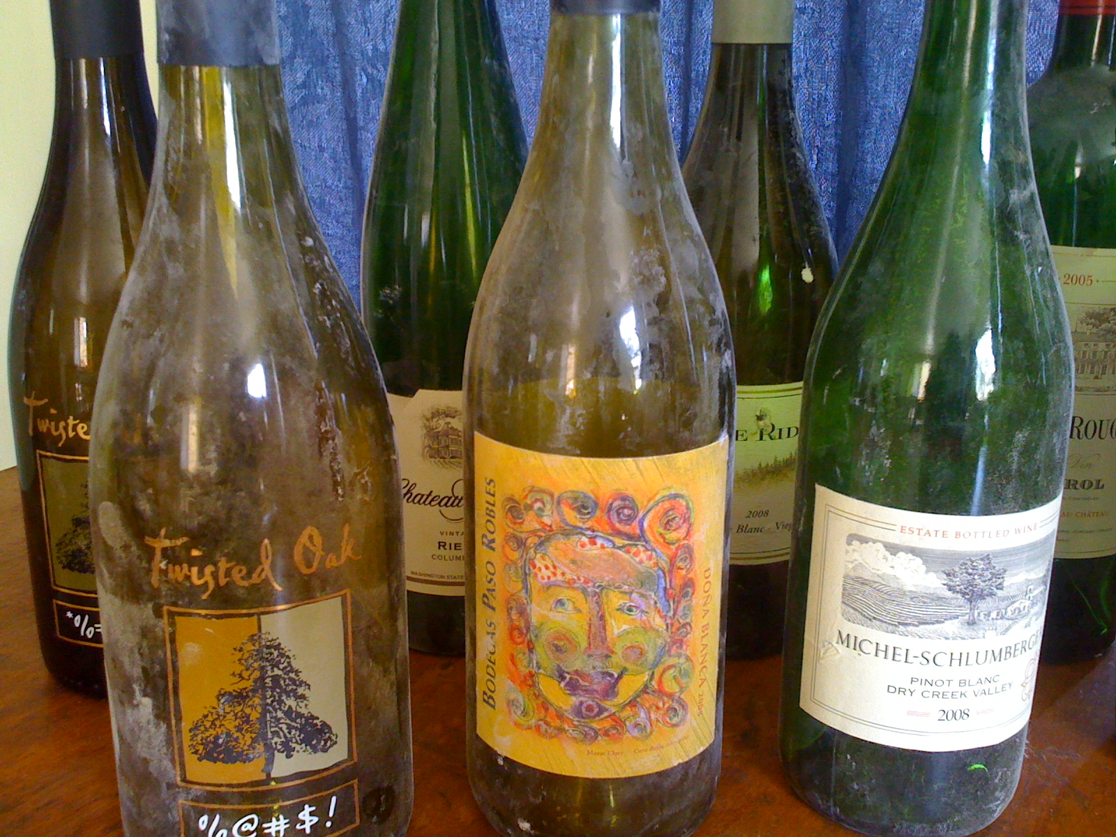 -up. We drank a rhone blend from Twisted Oak and a wild yeast syrah from Vino V and others; the shot of the dust on the bottles gives you a clue about the environment out there! Finally, BMIR announced that the Man would Burn and it was time to head out to the playa.