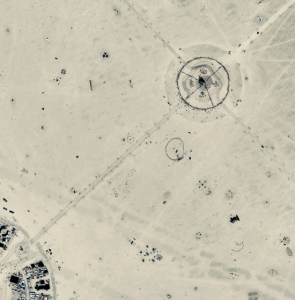 Center camp is easy to see if you know where to look: it’s the darkest spot in the image, with a ring road circling it. That’s where people often congregate for music and coffee and yoga and more. It’s a great place to laze on a sunny afternoon or to take refuge from the cold dark night.