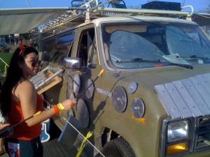Since I was speaking at the LA Decompression 2010 EcoSalon, we arrived bright and early–about 1:30. Even though the event started at noon, in true Burning Man fashion, most of us were struggling with wind and shade structures. There weren’t too many people around; most were working on their camps as well!