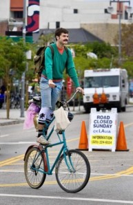 Anyway, on 10/10/10, CicLAvia will shut down seven miles of streets in LA, make them car free from 10am-3pm, and turn them into a “re-imagined, re-invented public space.”. Friends in the Bay Area have been enjoying similar events for months now and swear that it is a “gas” and especially fun for families. The event began in Bogota 30 years ago; now every Sunday streets are closed for people to enjoy. Read more about cicLAvia in this LA Times article–that’s also where the photo of Bobby Gadda on his tall bike came from: In the heart of L.A., wide open spaces, courtesy of CicLAvia – latimes.com.