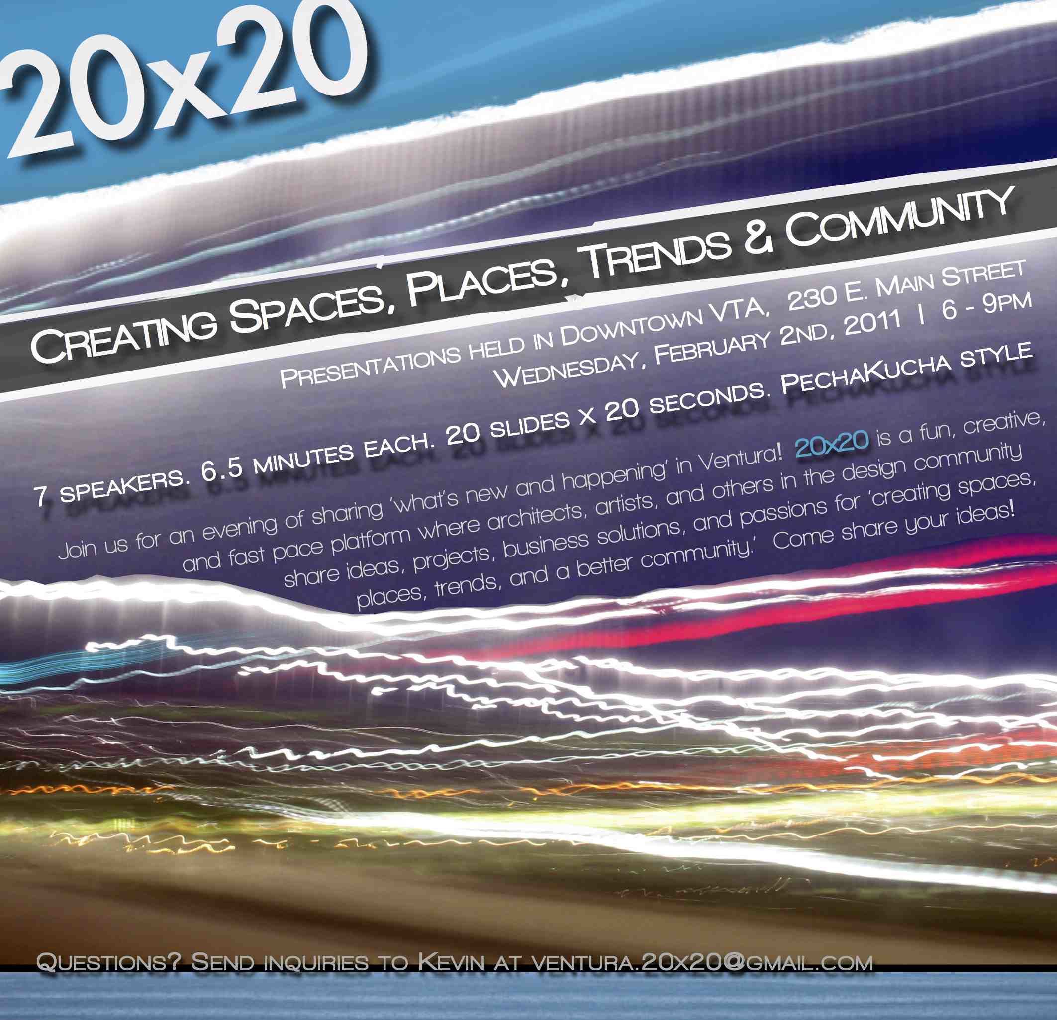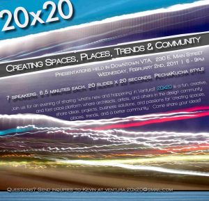 Ventura’s 20×20 event this Wednesday, February 2nd, 2011 offers food and good times. Take this as an opportunity to mix with the community and push forward fresh dialogue on what’s happening in Ventura!