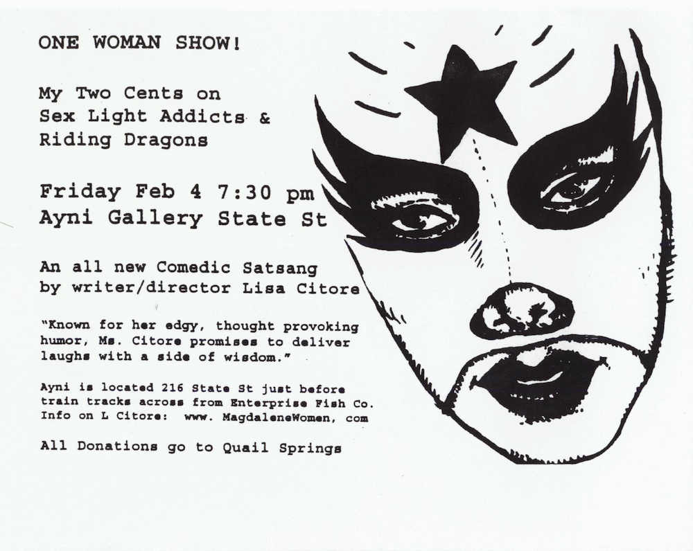 She’s written several plays and monologues including her newest one woman show “My Two Cents on Sex Light Addictrs & Riding Dragons” which she will present TONIGHT Friday February 4 at 7:30pm at the Ayni Gallery on State Street in Santa Barbara.