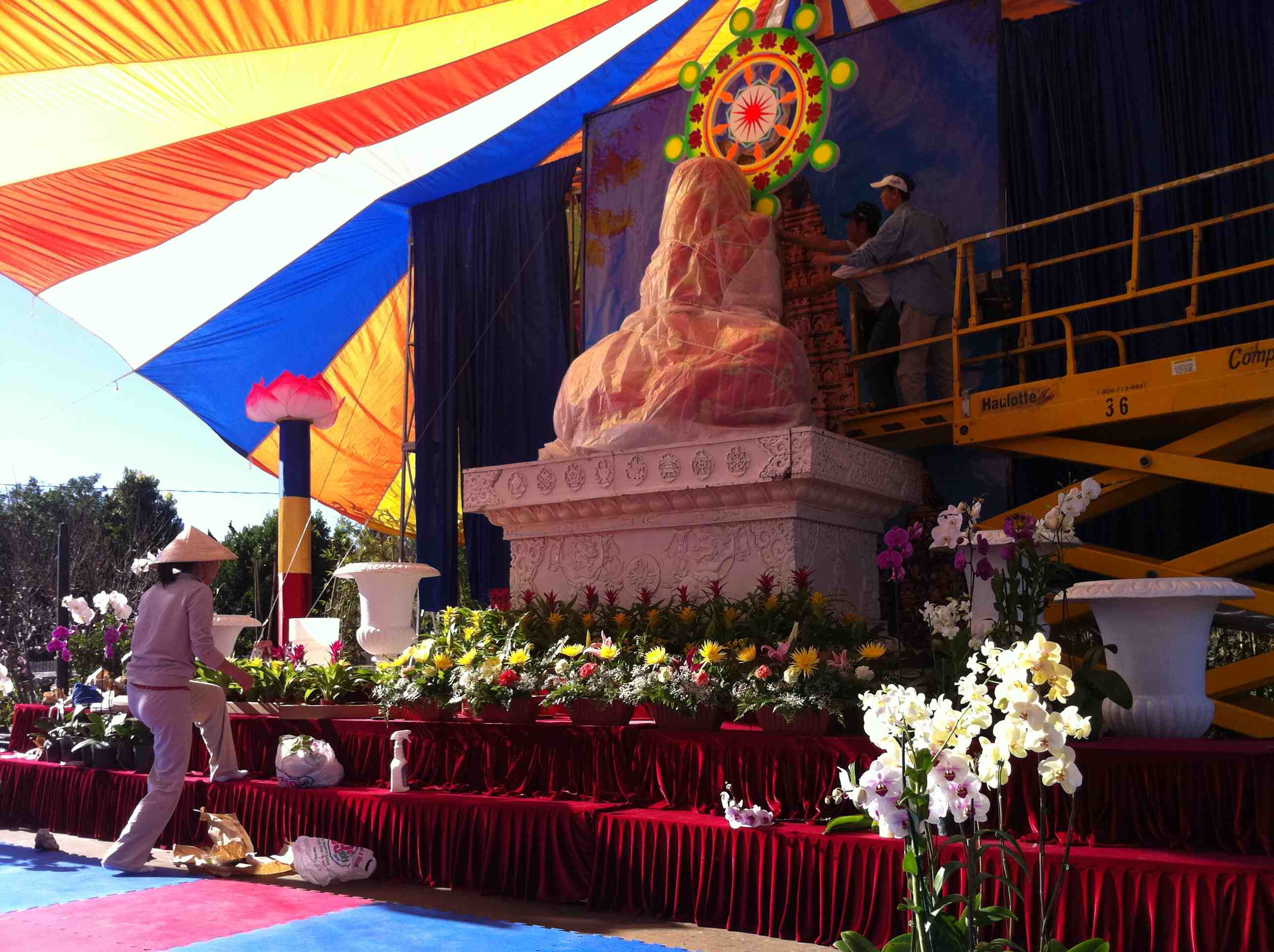 Several monks in orange garb and nuns in grey scurried around giving directions to the many Vietnamese people there getting everything ready. Flowers are everywhere, some already in arrangements, others waiting to be placed.