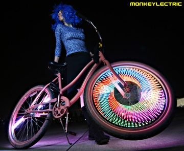 So if you have nothing else at Burning Man but your birthday suit, sunscreen and water, you need a bicycle with working head and tail lights. If you have lights that make your bicycle distinct, your friends will thank you for it–and you will be even safer out there on the playa. We love our Monkeylectric lights which are fun for Burning Man or on our monthly ArtRides! (pictured) They’re about $65.