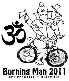 Today as I’ve been riding my bike around Black Rock City with a Burley trailer attached with two kids in it, I’m wearing my dress that I tie dyed with flames and that has Lord Ganesh riding a bike silkscreened onto it; we’ve been busy passing out lots of stickers this week with Lord Ganesh riding a bicycle and telling everyone about his birthday today, Weds August 31, 2011.