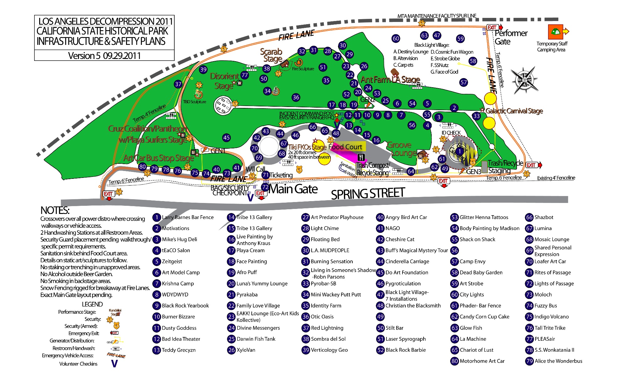 Here’s a pdf of the LA Decom 2011 FINAL map which shows the various theme camps and stages. LA_Decom_Stages_Line_Ups_2011
