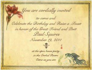 And so I cordially invite you to check out his poetry on his site (one of my favorites, Prayer and another Listen which you can read here and Listen which you can hear here ) or mine (search for Paul Squires) and to join a celebration, a birthday party if you will, held on his birthday and in an online performance space called “The Orchid Room” which Paul instigated. Curators are folks he held in high esteem, poets who he thought understood what he was after:
