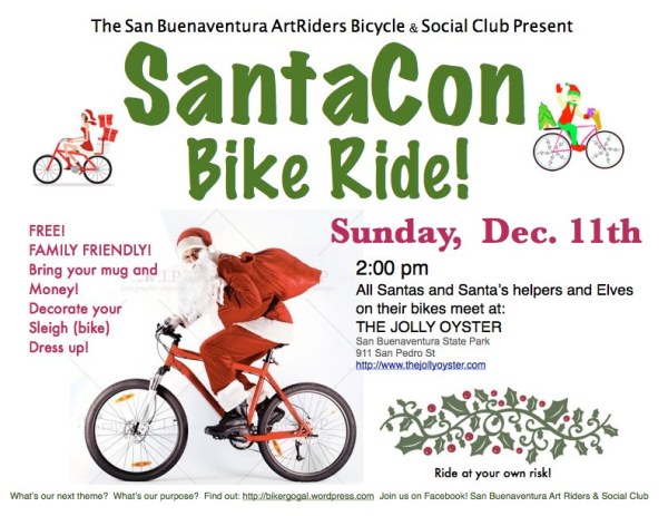 The third Santacon in Ventura is Sunday December 11. The plan is to meet at The Jolly Oyster at the Ventura State Beach, ride around, possibly stopping at Art City (197 Dubbers) and elsewhere as we please then return to the Jolly Oyster for a potluck. Vons is a quick bike ride away for anything we might need or have forgotten and we can cook clams on the BBQs there and shuck our own oysters. It’s a BYOB kind of place so bring yours!