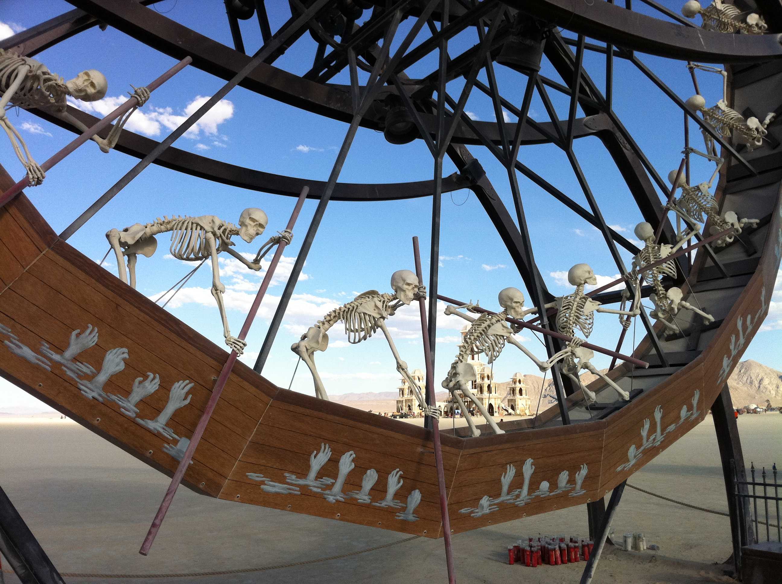In this brilliant yet exemplary piece of interactive art typical of Burning Man, six participants coördinated to pull ropes together to make strobe lights flash and a boat of skeletons rowing move across the “water” of the playa. Much of the art at Burning Man connects with mythological and archetypal material; Jung (1960) wrote that “It is absolutely necessary to supply these fantastic images that rise up so strangely and threateningly before the mind’s eye with some sort of context so as to make them more intelligible. Experience has shown that the best way to do this is by means of comparative mythological material” (p. 33). Burning Man supplies these experiences and meets this need.