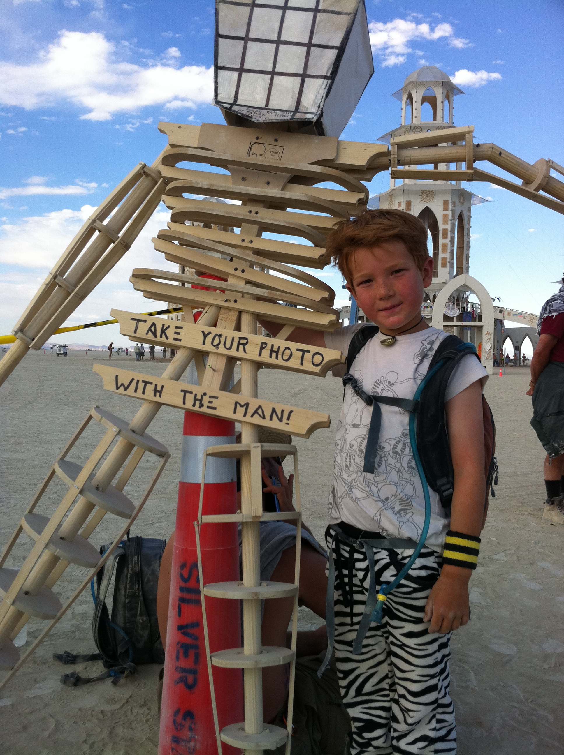 In 2005 with a Burning Man theme of Psyche: The Conscious, Subconscious and Unconscious (which I am sure was no accident), I returned to Black Rock City with my new husband and 20 month old son to the camp that I had formed in 1997—and immediately ran into a shadow that had not been integrated by the Ten Principles. After a two-year absence, many in “my” camp didn’t know who I was, and they didn’t want a baby in camp either. Our friend who had organized the camp in our absence climbed onto a table and lectured everyone there that the camp would not exist without me. That I was “the original burner,” that none of the organizers of the camp would have been there without me, and that everyone there should respect me and accommodate my family. Even with one of the Ten Principles proclaiming “radical inclusion,” many people at Burning Man do not want children there. Some feel that we are wrong to bring our children, that it is an inappropriate environment while others don’t want their own freedom impinged upon by the fact that children are around. We eventually chose to camp near some Burning Moms that I knew from an online group. (Photo above from 2007 with my son on my right and another child on my left; read about this artwork here).