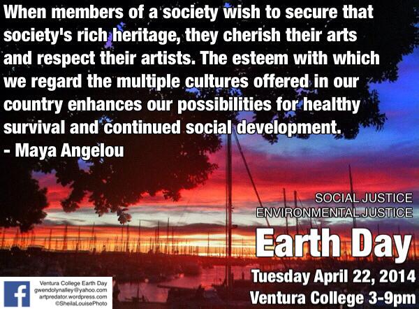 This is also what we are trying to accomplish at Ventura College’s Earth Day with musician/speakers like Alice Bag, Tony Fletcher, Linda Ravenswood of the RavenswoodJones, and Abel Garcia who will be speaking about how music is transformative, and through the transformation, how we can be change agents in creating a more just world. Poets and other performers like Mary Kay Rummel, Pat Payne, Sharon Gorsch, and F. Albert Salinas will be doing environmentally themed works that raise awareness and appreciation, plus research presented by students to encourage us all to take action. The City of Ventura and other local groups will offer interactive displays and activities to encourage us and inspire us to be more gentle to the planet while living full and creative lives.