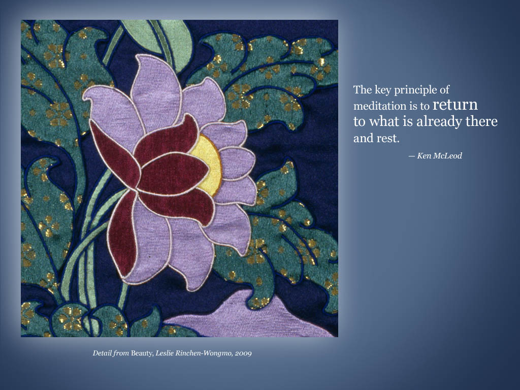TOP IMAGE: Silk Thankga Detail by Leslie Rinchen-Wongmo from one of her Weekly Wake-ups which provide a thread of inspiration. One of the only westerners trained in the rare Buddhist art of silk applique thangkas, Leslie is passionate about the preservation and evolution of this Tibetan cultural tradition. His Holiness the Dalai Lama gave his blessings to Leslie’s work and encouraged her to make images that speak to the spiritual aspirations of people across religions and cultures.