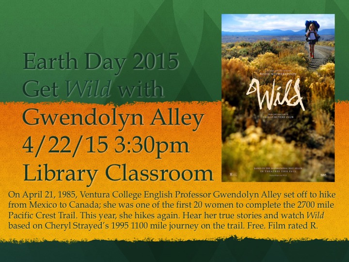 Join me on Earth Day to hear stories from my adventure and watch the R rated film Wild based on Cheryl Strayed’s 1995 1100 mile journey on the trail. The event is free and open to the public. Find us in the Ventura College library classroom from 3:30-6pm Weds. April 22, 2015.