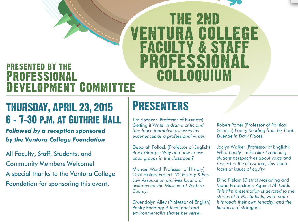 Tonight Thurs. April 23, I will be presenting a short set of poetry as part of the Second Ventura College Faculty and Staff Professional Colloquium.