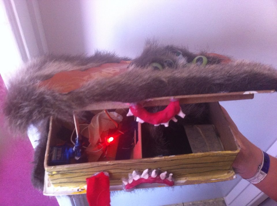 Also, this is his third summer attending a Wizardry and Literacy Theater Camp, and his first summer attending a Harry Potter themed “maker” camp in Berkeley at Curiousity Hacked Oakland where he made the Monster Book of Monsters shown above as well as a mandrake (that shrieks!), the Patronus lantern below, and much much more shown in the photo above of his house gear. (And yes the Harry Potter Hackwarts was definitely ahighlight of his summer –and his life!)