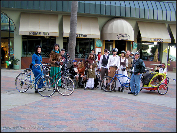The first Steampunk Ride in 2010 was during First Fridays while the second Steampunk Ride was during the April 2010 Artwalk. For that one, we made a few different stops and finished at Bell Arts where my great grandmother (actually my mom Suzanne Paquette Lawrence) traveled through time from 1910 via a Steampunk Time Machine to regale us with her stories of old-time Ventura, then we held a kids Steampunk Fashion Show. Now THAT was a day to remember.