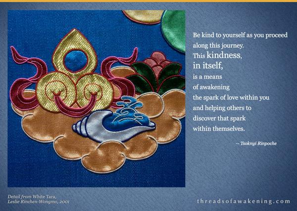 Artwork above by Leslie Rinchen-Wongmo who is trained in the rare Buddhist art of silk applique thangkas. His Holiness the Dalai Lama gave his blessings to Leslie’s work and encouraged her to make images that speak to the spiritual aspirations of people across religions and cultures. Read Leslie’s blog here and learn more about her work.
