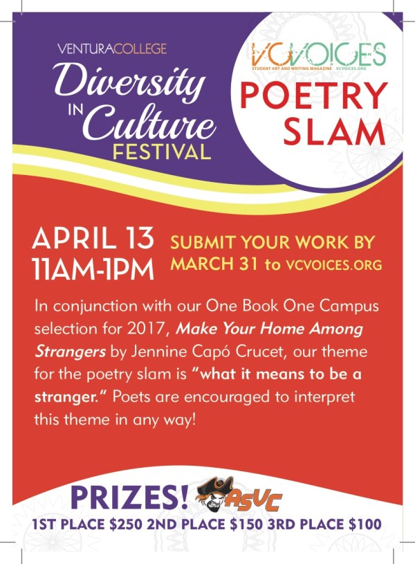 We are also busy planning Ventura College’s second annual Culture in Diversity Festival on April 12 and 13 from 930am-9pm. Wednesday highlights include evening readings by Alice Bag, Tony Fletcher, and Zhena Muzyka. Thursday’s highlights include a Poetry Slam by area and VC student poets plus Richard Blanco from 1-2pm and Donna Granata on women artists and activists from 3-4pm.