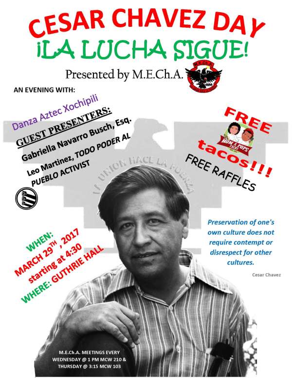 You are invited to this year’s Cesar Chavez Event at Ventura College hosted by M.E.Ch.A on Weds. March 29 starting at 430pm in Guthrie Hall. The event is free and open to the public and Danza Azteca Xochipili will start the evening right outside in the quad area plus free food from Mom and Pops restaurant will be provided while provisions last.