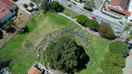 Ventura Climate March, Mission Park, Drone photo by Maxwell Mandell, Rainbow and Unity Circle.
