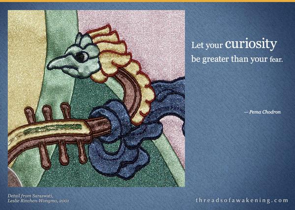 “Let your curiosity be greater than your fear,” says Pema Chodron as reproduced in this image using a detail from an artwork by Leslie Rinchen-Wongmo.