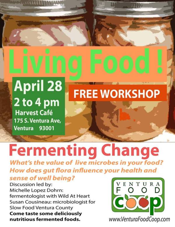 Ventura Food Co-op presents a discussion and workshop on Living Food- Fermenting Change at the Harvest Cafe on Saturday April 28th from 2-4 led by Michelle Lopez Dohrn: fermentologist with Wild at Heart and Susan Cousineau: microbiologist for Slow Food Ventura County; workshop follows from 4-6p. What’s the value of live microbes in your food? How does gut flora influence your health and senses of well being? Come taste some deliciously nutritious fermented foods with the Ventura Food Co-op and friends,workshop follows from 4-6p.