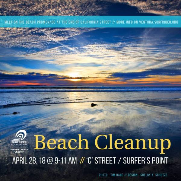 In Ventura on Saturday, April 28 from 9-11am meet on the beach promenade at the end of California Street for a beach cleanup. Wear comfortable clothes, closed toed shoes and sunscreen. All are welcome to participate by signing a liability waiver, but volunteers under 18 MUST have a parent or guardian present at the beginning of the cleanup to sign a liability waiver before the minor can participate. Pre-registration is NOT required unless your group is larger than 25 people (if it is, then email beachcleanups@ventura.surfrider.org ). Supplies provided, but volunteers are always welcome to bring their own work gloves, trash bag/bucket, and/or reusable water bottle to reduce waste. Please be prepared to fill out a data card of all the trash you pick up to help find the sources of trash.