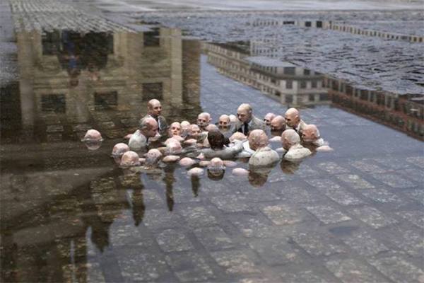 This sculpture called “Follow the Leaders” found in Berlin and created by Isaac Cordal has been dubbed ‘politicians discussing global warming.’ Isaac Cordal, a Spanish Galician artist born in 1974, often designs works which involve sculpture and photography in the urban environment and that call attention to environmental problems with a focus on global warming.