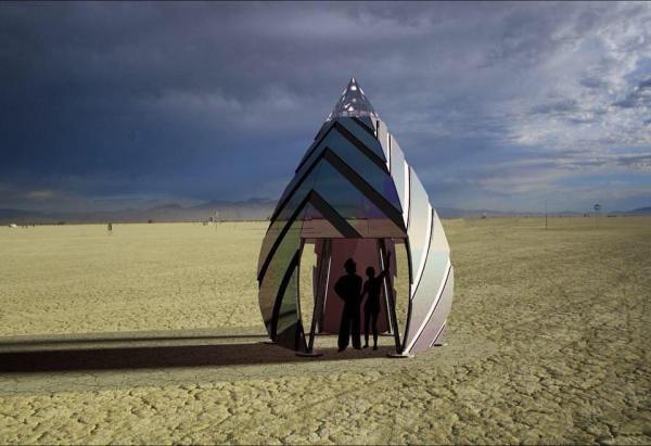is a 20 foot tall faceted teardrop-shaped tower made from bent steel tubing. Clad in iridescent laser-cut paneling, the installation will be a shimmering tear when illuminated at night. Gazing upwards within the hexagonal interior, participants observe a colorful glass gem suspended above a conical mirrored structure. Participants are invited to create a shared experience with each other by powering & observing the spinning gem box. Utilizing two different handles, participants will create & fluctuate the complex rotation & spin of the gem box. Without communal effort the kaleidoscope’s image will remain static. Reflections of the colors & complexity of motion will create a fantastic kinetic kaleidoscopic image. At dusk, the laser cut paneling will reveal backlit patterns of light that make the kaleidoscope a waypoint in darkness. A frosted cap atop of the structure will create a glowing beacon that will be seen across the playa.