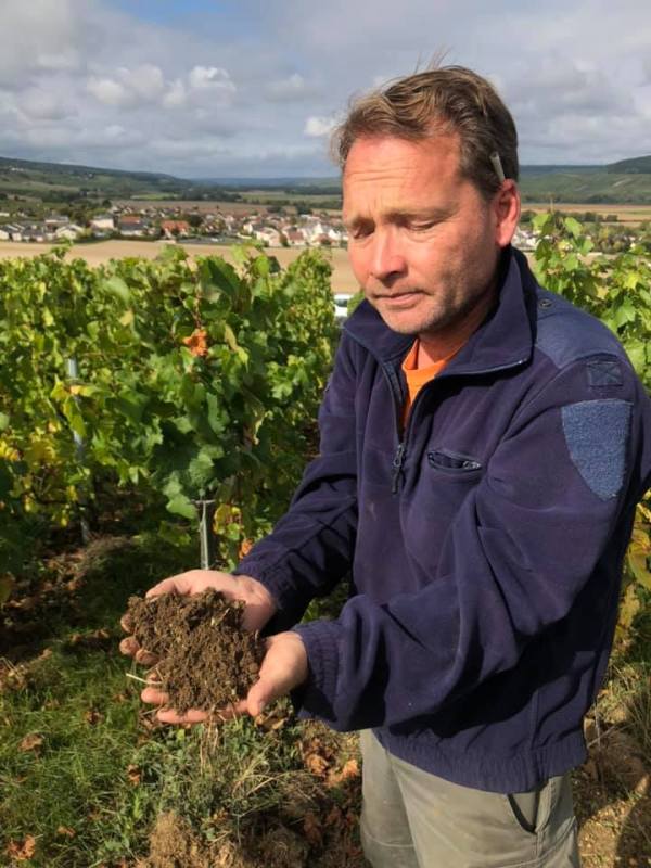 Near Mardeuil, France, biodynamic Champagne winemaker Vincent Charlot holds his most precious asset: healthy soil. To make the best champagne, Charlot says he must “understand the mind of the soil.” Biodynamic practices direct Charlot in how to listen and learn from the soil in his vineyards.