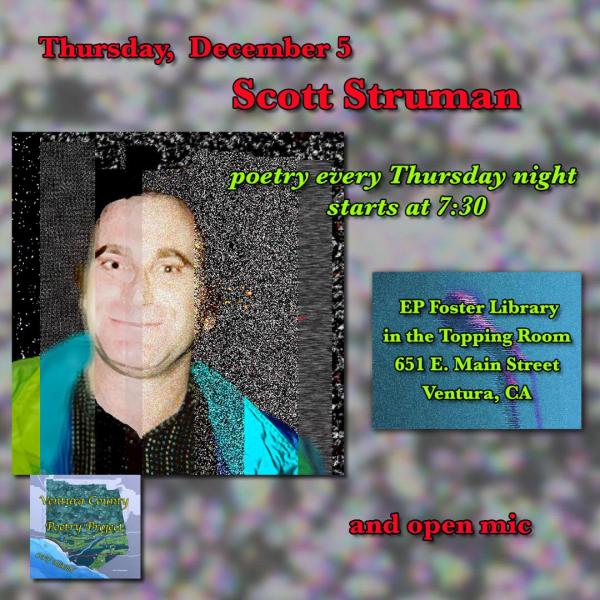 This Thursday, Dec. 5, at 730pm the Thursday night series in the EP Foster Library Topping Room (651 E. Main, Ventura) hosted by Phil Taggart features Scott Struman. During the open mic that follows, some of my Ventura College students and I will be there.