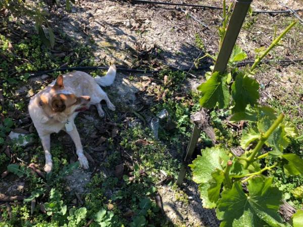 Cisco the Wonder Dog rests in the shade of a tangerine tree after doing battle with a bee. The grenache vines pictured have been chomped on by deer.