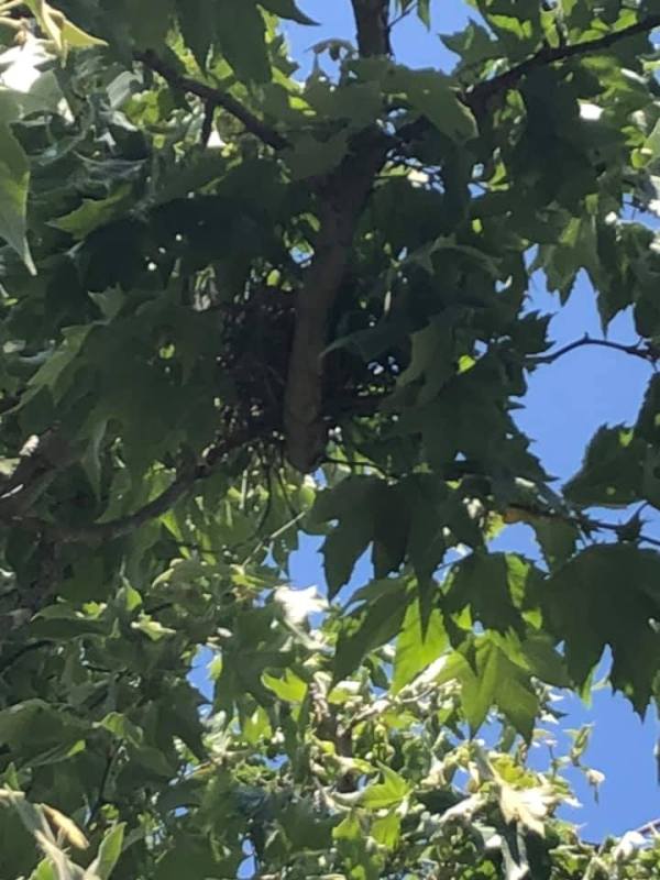I’ve seen a pair of scrub jays at my feeder and perched on the top of my sycamore tree. Today the pair of jays were fending off a pair of ravens (maybe crows?). I went out to disrupt the action and saw above my head the nest the jays had been defending.