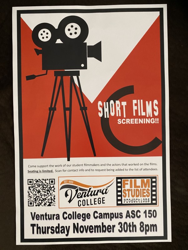 Tonight and tonight only, Ventura College film students share their short films. It’s free but seating is limited and you have to RSVP. Screening starts at 8pm today in the Applied Science Center with showings of about 20 short films each lasting around five minutes. One of my students Julian Tlaxcuapan has a film in the show titled “Karma” and it includes two of my students, Día Avila and Diane Dominguez. The event is free but reserving a seat is required: https://ventura.vbotickets.com/events