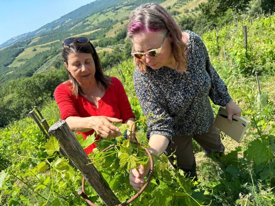 Wine Predator Gwendolyn Alley inspects the head trained vines with Antonella Manuli