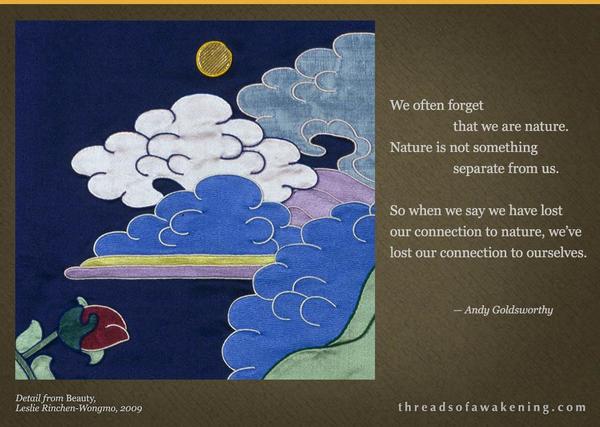 Art above by Leslie Rinchen-Wongmo, one of the only westerners trained in the rare Buddhist art of silk applique thangkas, she is passionate about the preservation and evolution of this Tibetan cultural tradition. His Holiness the Dalai Lama gave his blessings to Leslie’s work and encouraged her to make images that speak to the spiritual aspirations of people across religions and cultures. Leslie’ story is the subject of the acclaimed documentary film, Creating Buddhas: the Making and Meaning of Fabric Thangkas. Leslie mentors a select group of students around the world through her Stitching Buddhas Virtual Apprentice Program, and her Weekly Wake-ups provide a thread of inspiration to set your week on the path to awakening. Her autobiography is titled Threads of Awakening.